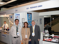 Viel Beachtung fanden die OCO - Präparate, die erstmals auf einer chinesischen Messe, von der Firma Meco, präsentiert wurden. Dem engagierten Team von Mister Whang (links) standen Hartmut Hummel (2. von rechts) und Diana Trapp (2. von links) zur Seite.